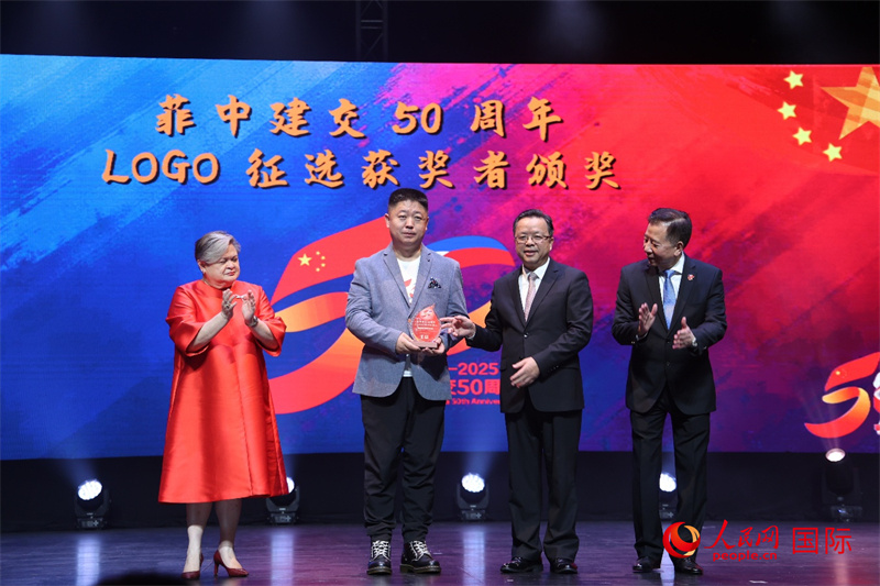 黄溪连和菲外交部候任部长拉扎罗给菲中建交50周年庆祝活动标识设计获奖者颁奖。人民网记者 樊帆摄