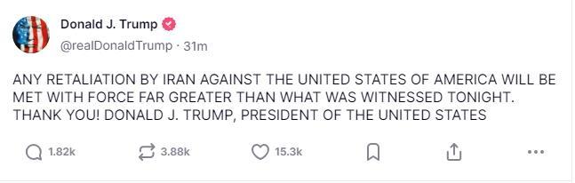 据报道,特朗普写道,“伊朗对美国的任何报复,都将遭到远超今晚所见的强硬回击。”