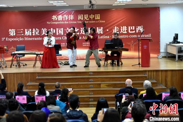 当地时间6月28日,巴西圣保罗,中国传统音乐乐团百花乐团在第三届拉美中国文化巡回展上演奏国乐。中新社记者 林春茵 摄