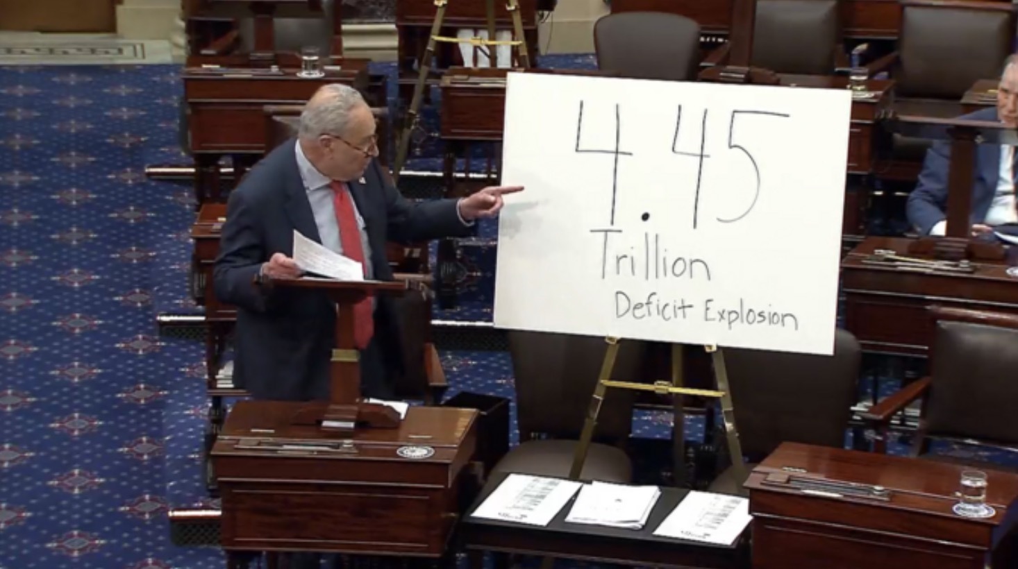 几个小时后,参议院少数党领袖查克·舒默(纽约州民主党人)也拿着一块自制纸板上台,还击称该法案实际上将增加4.45万亿美元联邦赤字。