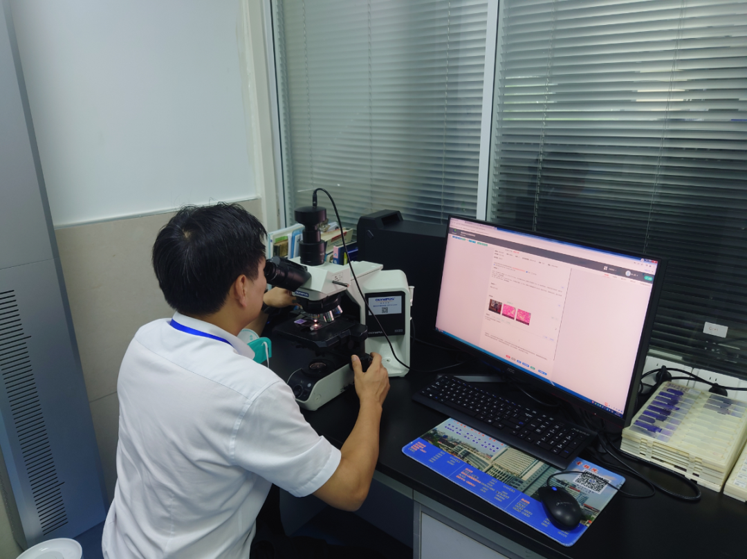 术中冰冻病理诊断是手术的关键环节,直接影响手术方案的调整。潜江市中心医院院长曾智、病理科主任黎三艳,迅速进行了线下紧急术中冰冻病理会诊。凭借精湛的技术和丰富的经验,他们在30分钟内迅速做出右中肺微浸润性腺癌和右下肺背段浸润性腺癌的诊断,为手术的精准实施提供了重要依据。