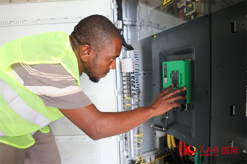 当地员工尼永姆正在水泵站检查高低压配电设备。人民网记者 沈小晓摄
