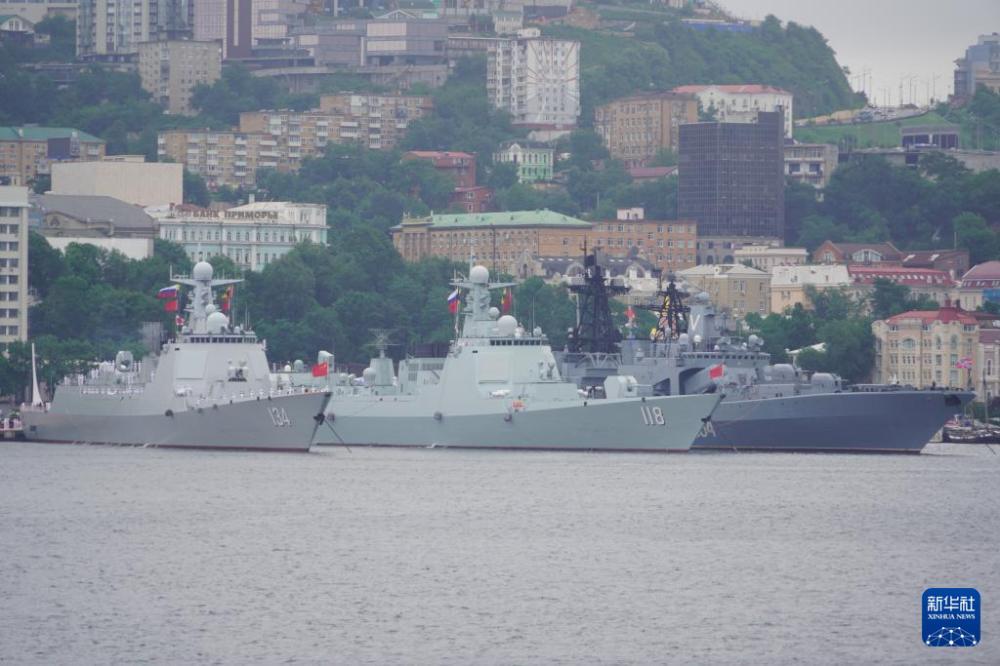 这是7月31日在俄罗斯符拉迪沃斯托克某军港拍摄的参加中俄“海上联合-2025”联合演习的中俄双方部分参演舰艇。