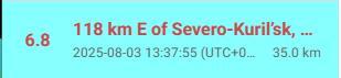 中新网8月3日电 据美国地质调查局地震信息网消息,俄罗斯千岛群岛北库里尔斯克以东118公里处于北京时间3日发生6.8级地震,震源深度35公里。