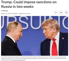 当地时间8月22日,美国总统特朗普表示,他将在两周内决定是否对俄罗斯实施“大规模制裁”。而就在此前一周,美俄首脑会晤刚刚在阿拉斯加举行,特朗普表示“会谈非常好”。