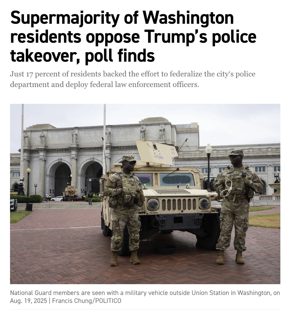△美国“政治”网站报道,79%的华盛顿特区居民反对联邦接管特区警务并部署国民警卫队的做法。