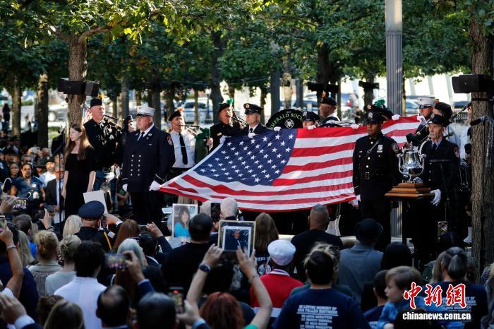 当天上午8点40分许,由纽约市警察、消防员等组成的仪仗队高举美国国旗走上讲台,一名17岁高中生唱响美国国歌,纪念仪式正式开始。8点46分,悼念的钟声响起,全场默哀。随后,遇难者亲属代表登台,依次念出所有遇难者姓名。