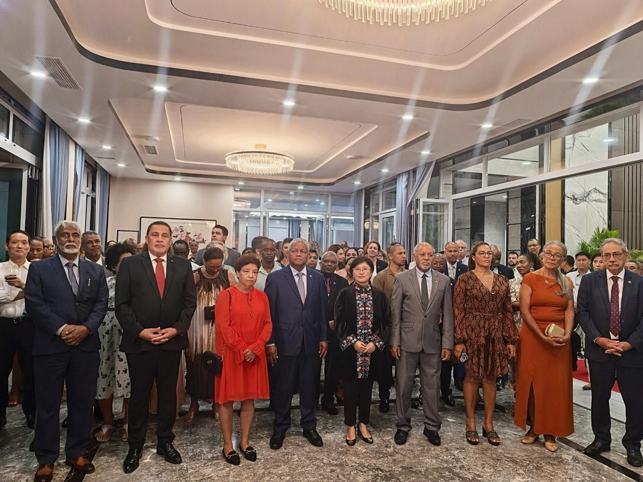人民网内罗毕9月17日电(记者黄炜鑫)维多利亚消息:中国驻塞舌尔大使馆16日在塞舌尔首都维多利亚举办庆祝中华人民共和国成立76周年招待会。中国驻塞舌尔大使林楠,塞舌尔总统拉姆卡拉旺夫妇、副总统阿菲夫夫妇、议长曼西安纳、外长拉德贡德及多位内阁部长、外国驻塞使节、华侨华人和各界人士出席。