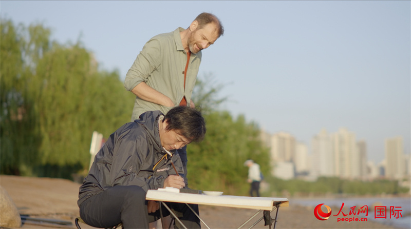 意大利艺术家马泰奥与中国艺术家陈明坤在黄河之滨共创。人民网 严小晶摄