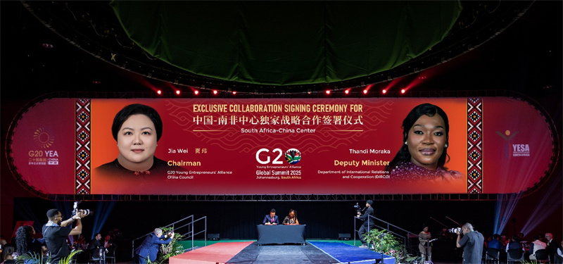 人民网约翰内斯堡9月22日电 (刘畅)19日,在南非约翰内斯堡举行了以“团结、平等、可持续发展”为主题的G20青年企业家联盟全球峰会。峰会上,在G20青年企业家联盟中国总部荣誉主席贾玮与南非外交部副部长莫拉卡的共同支持下,中国—南非中心正式宣告成立,这一重要时刻标志着中南青年企业家合作迈入机制化、深度化的新阶段。