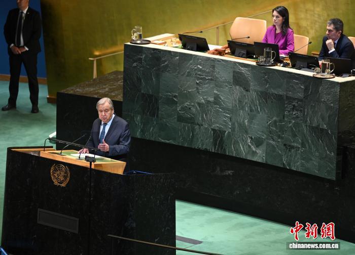 当地时间9月23日,纽约联合国总部,第80届联合国大会一般性辩论开幕。图为联合国秘书长古特雷斯在开幕式上致辞。 中新社记者 陈孟统 摄