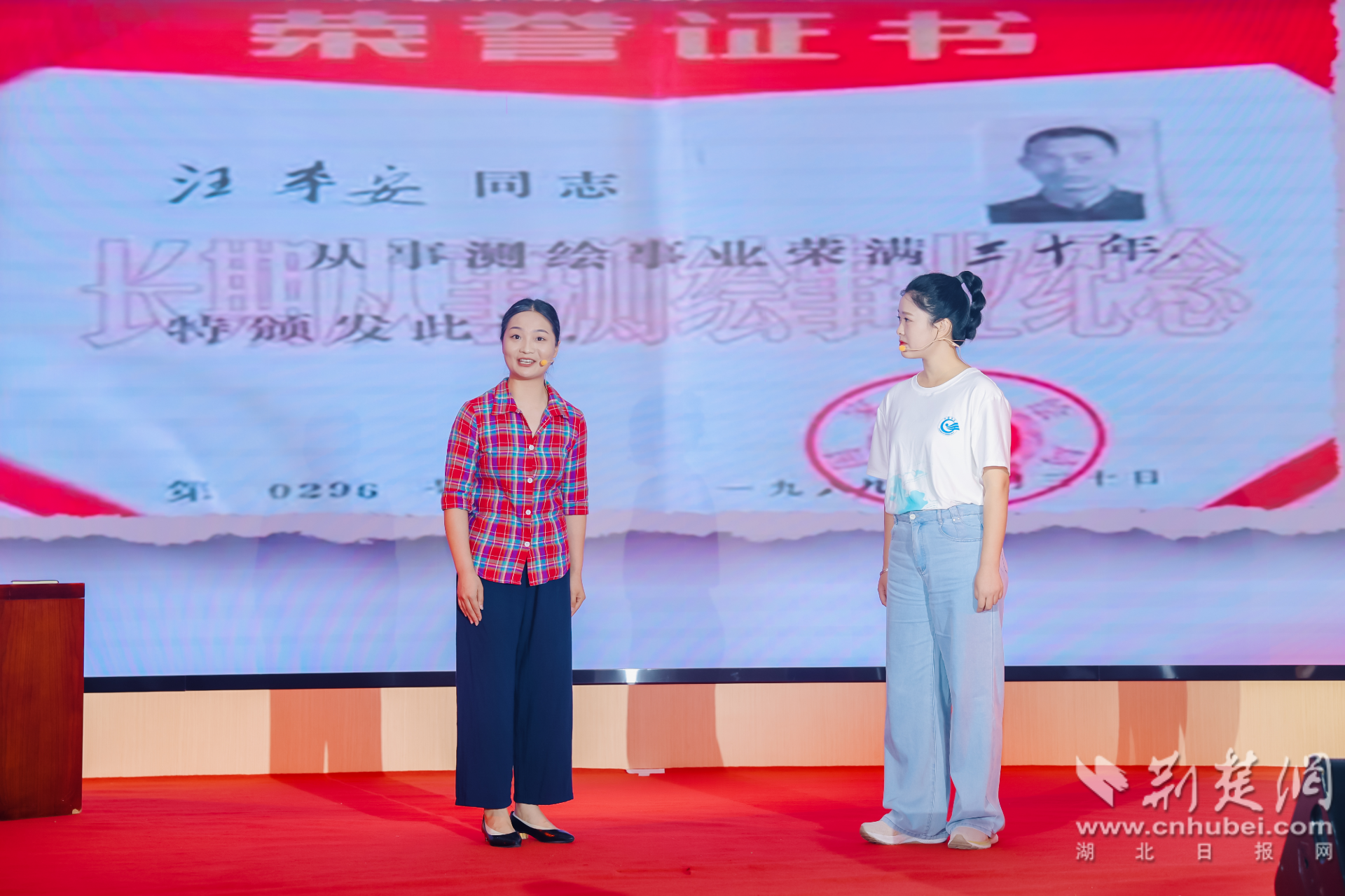 音乐党课以毛泽东诗词名句为脉络,在《江河万古流》的旋律中拉开序幕,分为三个篇章展开。在第一篇章《江湖安澜篇·高峡出平湖》中,天门市水文局讲述了祖孙三代74年扎根基层“把脉江湖”的故事;宜昌市水文局通过情景剧展现了从传统测量到无人机三维测绘、远程雷达波在线监测的水文技术变迁。展现了百年水文发展巨变,水利建设成果丰硕。
