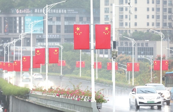 昨日,北京路熊家湾立交桥两侧悬挂的一面面五星红旗与桥面花卉景观带交相辉映,将道路装点得喜庆而庄严。