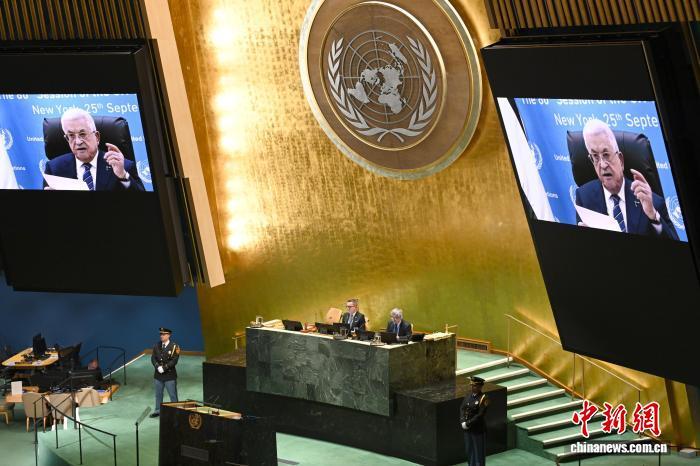 当地时间9月25日,纽约联合国总部,巴勒斯坦总统阿巴斯以视频形式在第80届联合国大会一般性辩论中发言。 中新社记者 陈孟统 摄