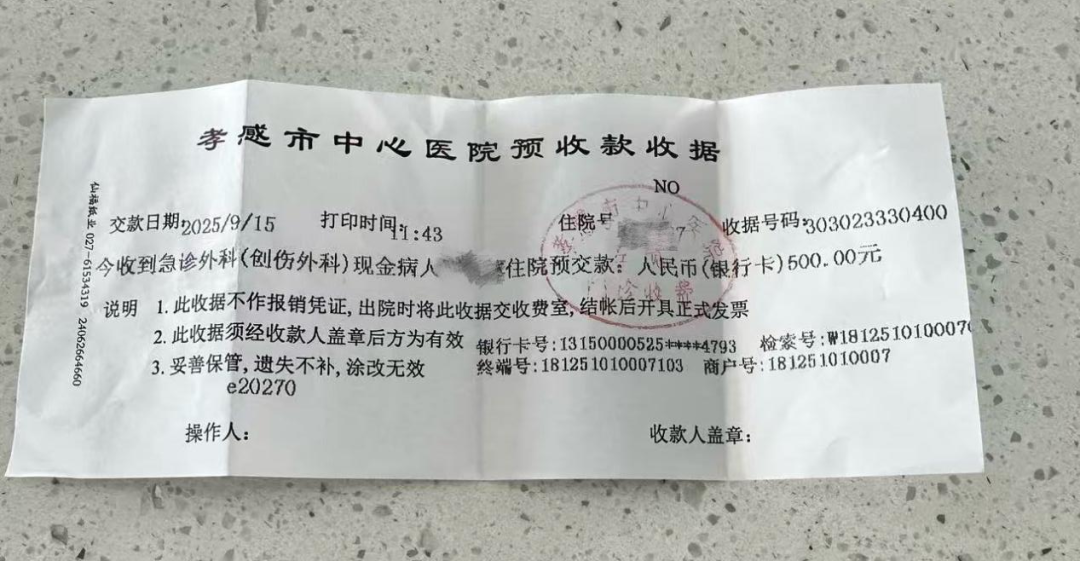 荆楚网(湖北日报网)讯( 通讯员 张梓萱)9月15日,孝感市中心医院急诊外科发生了感人至深的一幕。一位七旬老人因外伤致肋骨骨折,被紧急送至医院。面对身无分文且无法联系家人的困境,医护人员挺身而出,用实际行动诠释了医者仁心。