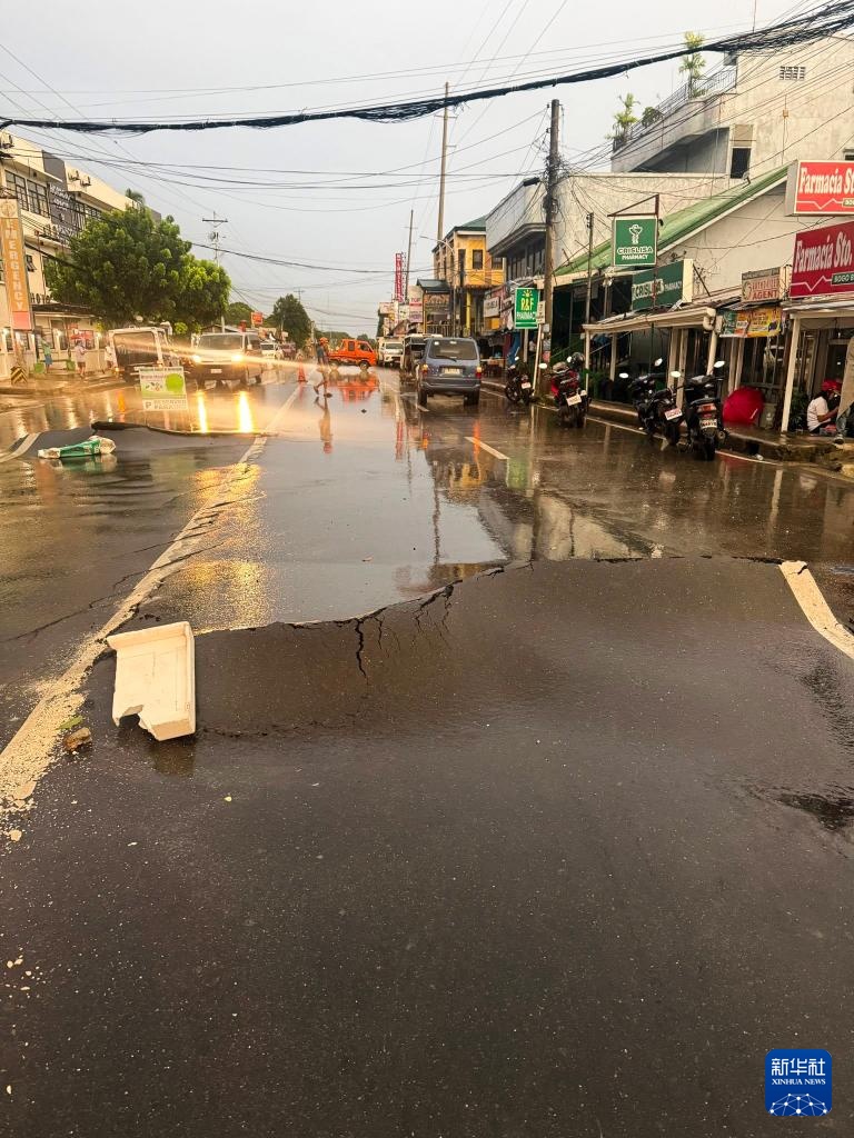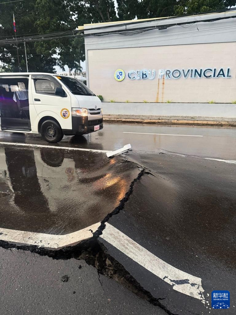 这是10月1日在菲律宾宿务省拍摄的在地震中损坏的道路。新华社发(宿务省地方政府供图)