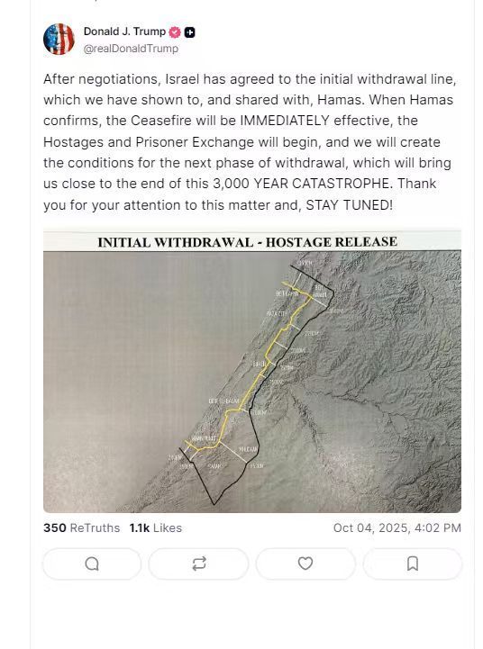 当地时间10月4日,美国总统特朗普在其社交平台“真实社交”发文称,以色列已同意加沙地带初步撤军路线,并将相关方案与巴勒斯坦伊斯兰抵抗运动(哈马斯)共享。一旦哈马斯确认,停火将立即生效,被扣押人员与囚犯交换随即启动。