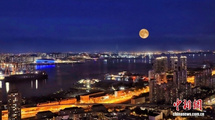 辽宁大连,中秋节一轮圆月从大连梭鱼湾东方海岸线升起。