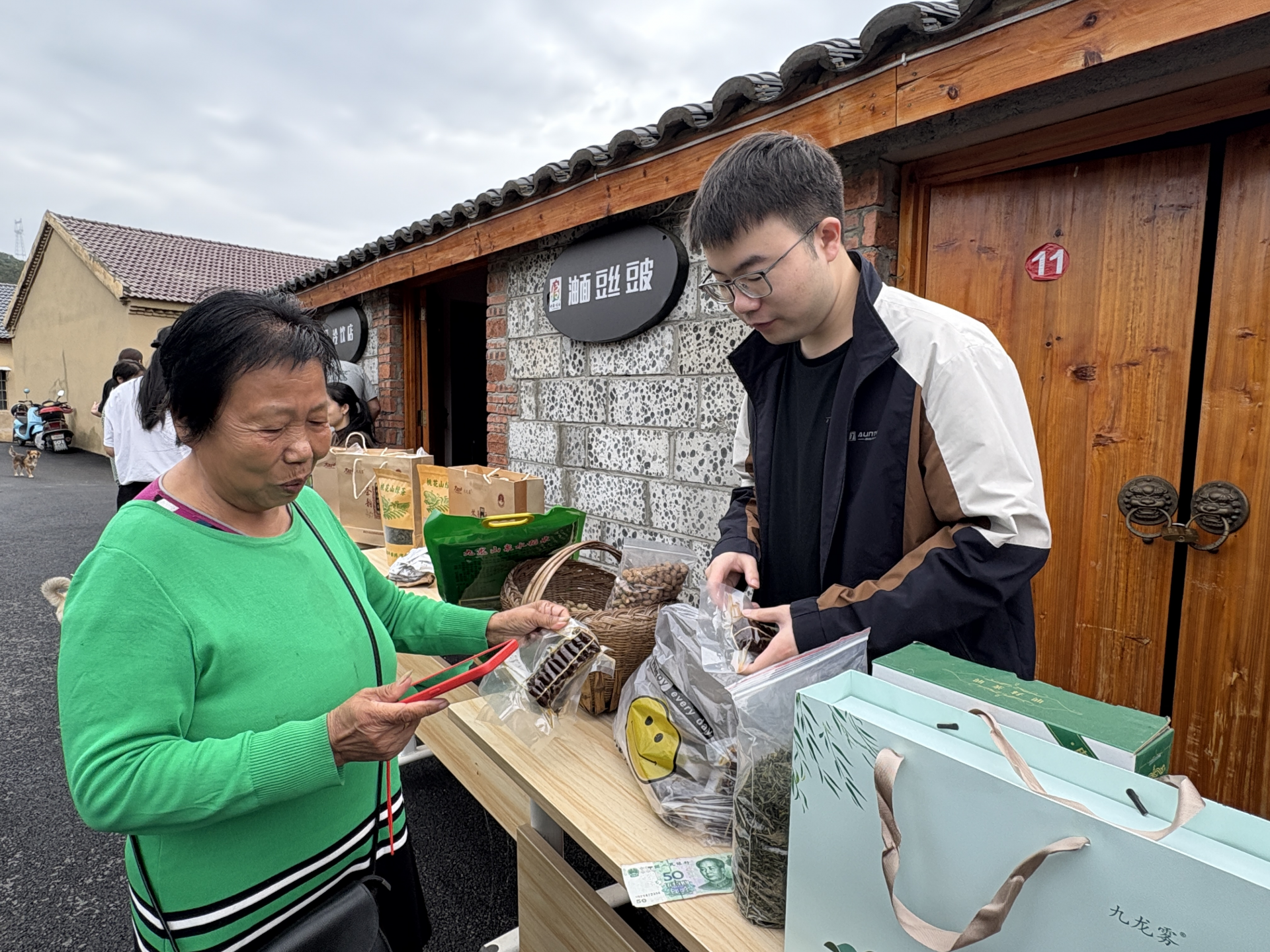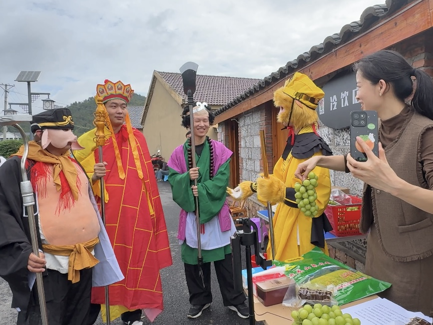 为了增添活动的趣味性和传播力,镇党委、政府特别安排了志愿者扮演唐僧师徒四人,作为推荐官在直播间为大家推荐各类好物,吸引了不少粉丝进到直播间。随后,还沿着林涧小隐、鱼鳞坝巡展,与村民互动,不仅为展销会增添了欢声笑语,也让乡村振兴的理念以更生动的方式深入人心。