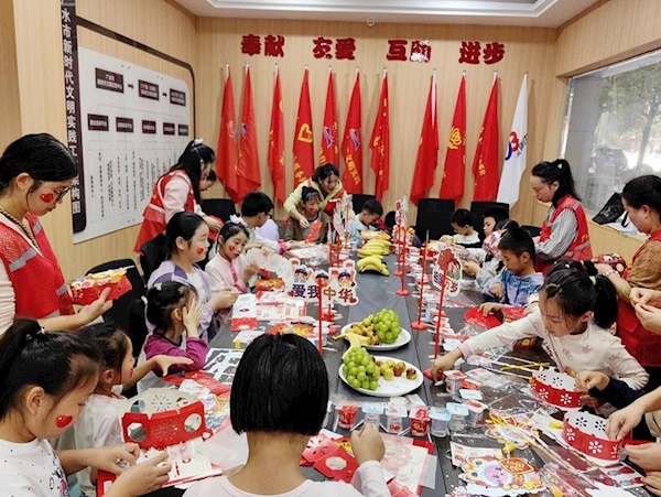 近日,广水市新时代文明实践中心开展“喜迎双节·童叟同庆”主题活动,与街道的“一老一小”们共话文明家风,共庆佳节。图为义工老师和孩子们一起制作手提灯笼。