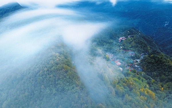阴雨织就薄纱,轻轻笼住武当仙山,让群山中的宫观多了几分水墨丹青的雅致。图/记者张建波