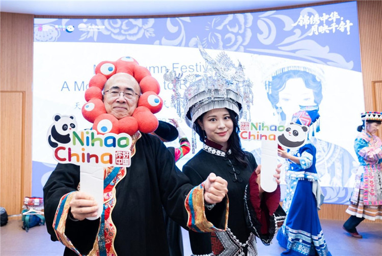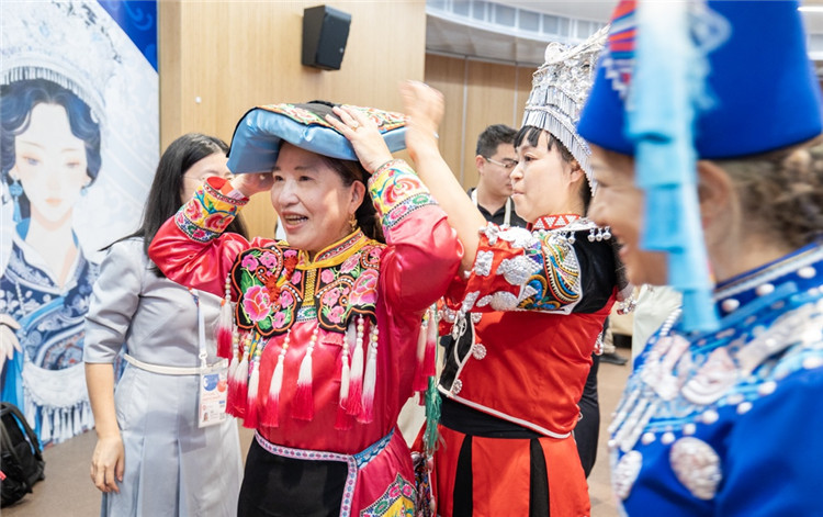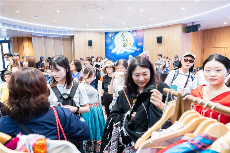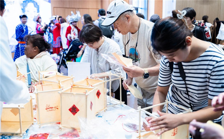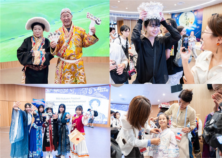 在互动体验区,参观者们兴致盎然地参与刺绣杯垫制作,在工艺师的指导下,亲手绣制月亮、玉兔等图案,体会一针一线中的匠心之美。在“月兔捣药”香包与“中秋揽月”宫灯制作区,嘉宾们在动手创造的过程中,深入感受了中国传统手工艺的趣味与智慧。民族服饰体验区尤为热闹,各国来宾纷纷换上苗族银饰盛装、藏族藏袍等民族服饰,拍照合影,留下难忘瞬间。