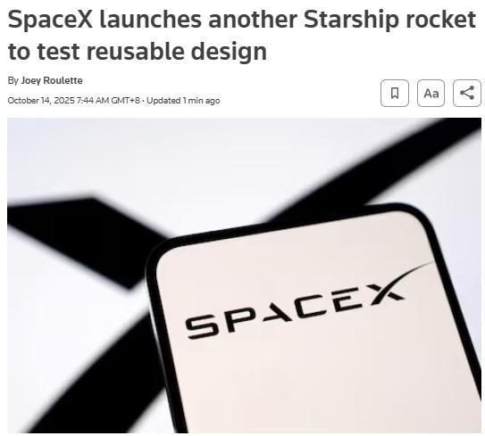 中新网10月14日电 据路透社报道,当地时间13日,美国太空探索技术公司(SpaceX)新一代重型运载火箭“星舰”从得克萨斯州发射升空,实施第11次试飞。