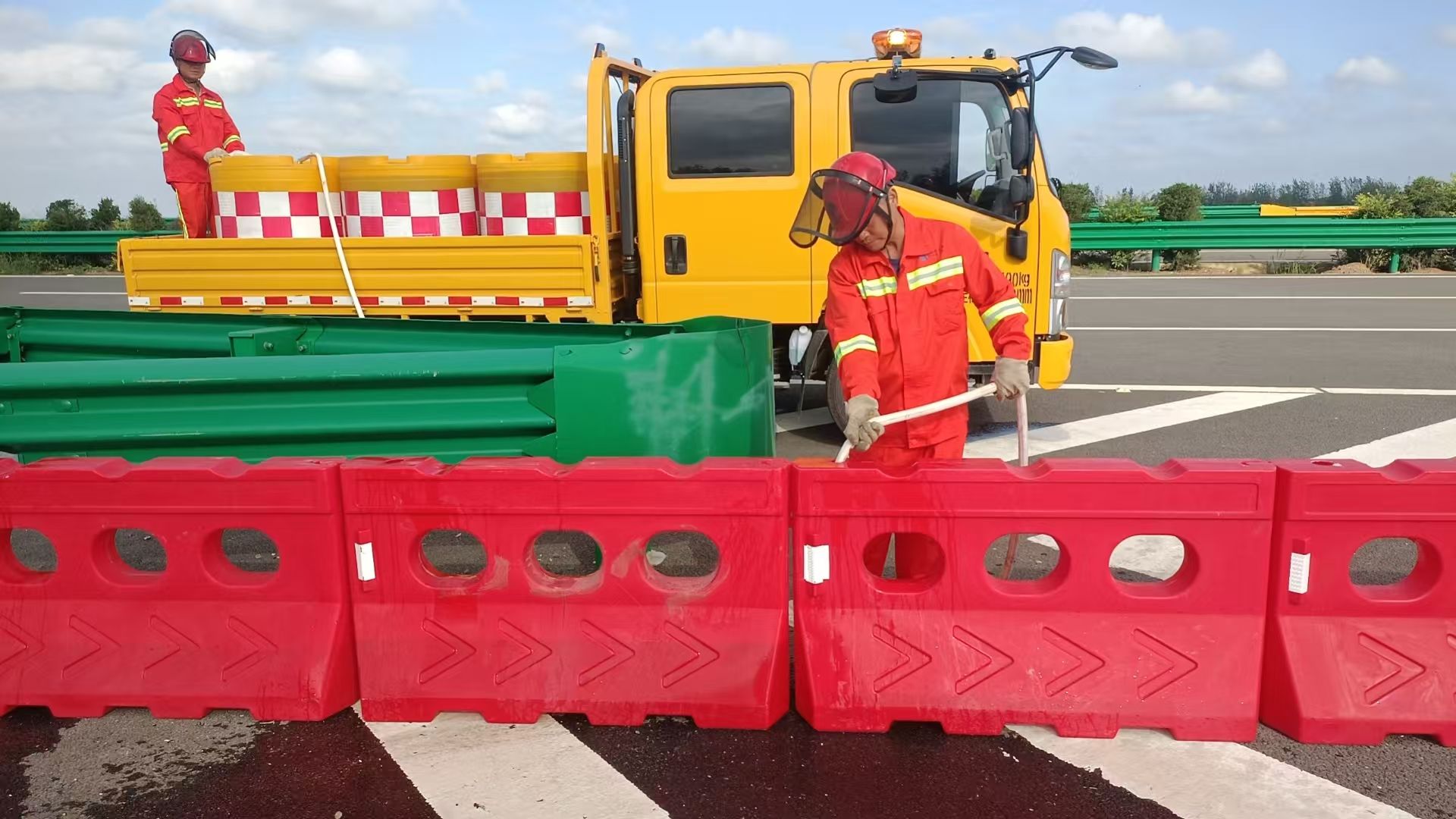 图:汉孝向K291+487三角端摆放警示提醒的水马并进行应急注水
