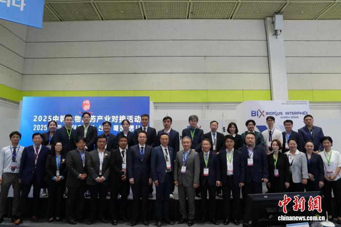 10月15日,“2025中韩生物医药产业对接活动”在韩国国际生物医药展会期间于首尔举办。图为活动合影。中新网记者 刘旭 摄