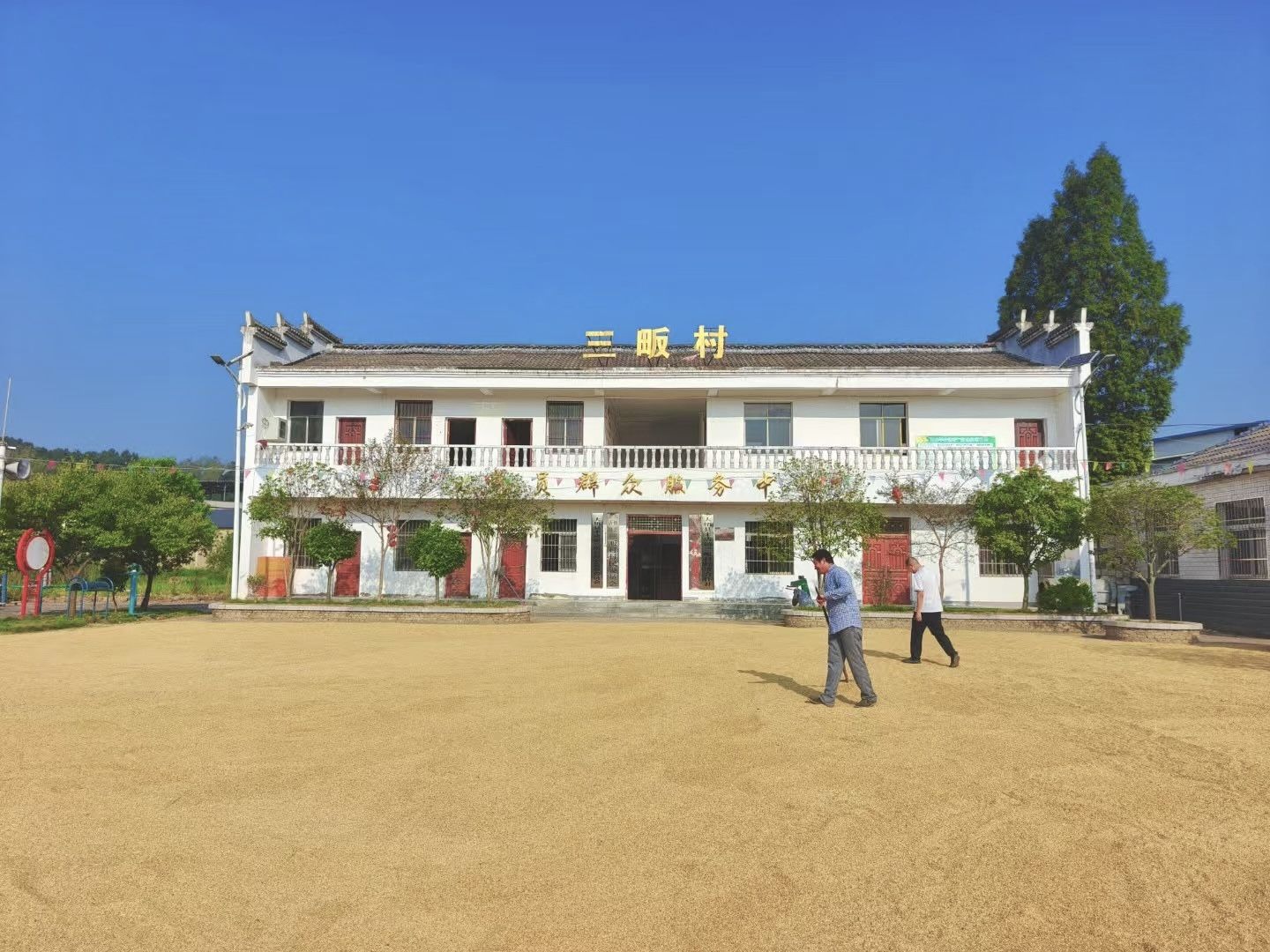 连日来,该镇各大村委会门前广场,总是一派繁忙喜悦景象:金灿灿的稻谷铺就“黄金毯”,村“两委”党员干部穿梭其间,弯腰翻晒、快手装袋,帮村民抢收粮食——这片平日的村民活动场,如今成了全镇16村“公共晒场”的生动缩影。
