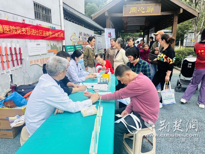 在另一角落,医护人员耐心讲解健康知识,社保卡办理区的汉口银行工作人员忙个不停,为居民免费办理社保卡升级业务。