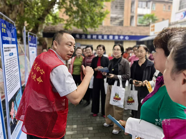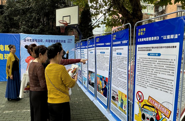 在社区幸福广场,一排排科普展板前围满居民。展板从无线电基本原理讲起,通过“以案释法”的形式揭露“黑广播”“伪基站”的诈骗手法,详细说明危害与识别技巧,引导居民合法使用频谱资源。
