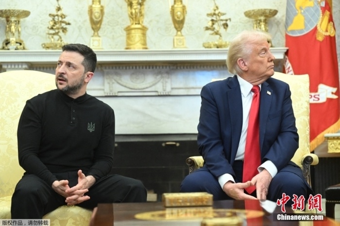 当地时间2月28日,美国总统特朗普与乌克兰总统泽连斯基在白宫举行会谈。会谈过程中,双方爆发激烈争吵,泽连斯基提前离开白宫。图为特朗普与泽连斯基会谈现场。