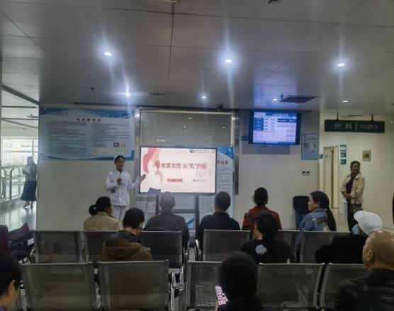活动期间,医院甲状腺乳腺外科主管护士张雯为门诊患者及家属带来了一场题为《关爱女性,从“乳”开始》的健康科普讲座。她结合临床典型案例,通过图文并茂的演示,系统讲解了乳腺健康知识,重点介绍了乳腺癌的高危因素、常见症状、自我检查方法、筛查手段以及健康的生活方式对预防乳腺癌的重要性。“月经来潮后的7~10天是自我检查的最佳时间,此时乳腺受激素影响较小,更易发现异常变化。”张雯展示了乳房自检的标准化流程——“一看二触三对比”,指导女性掌握每月自我检查的正确方法。
