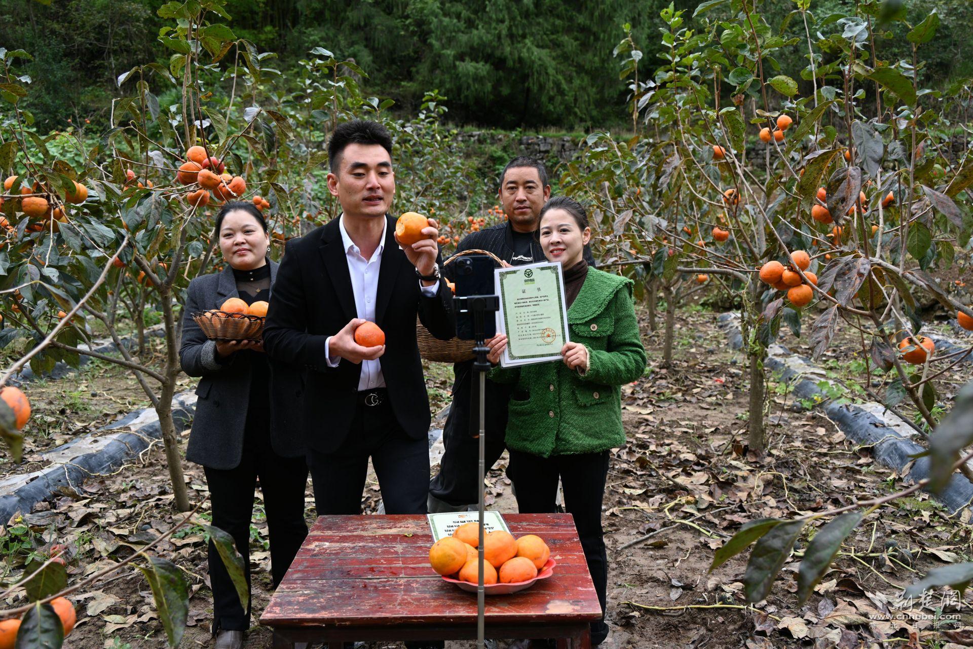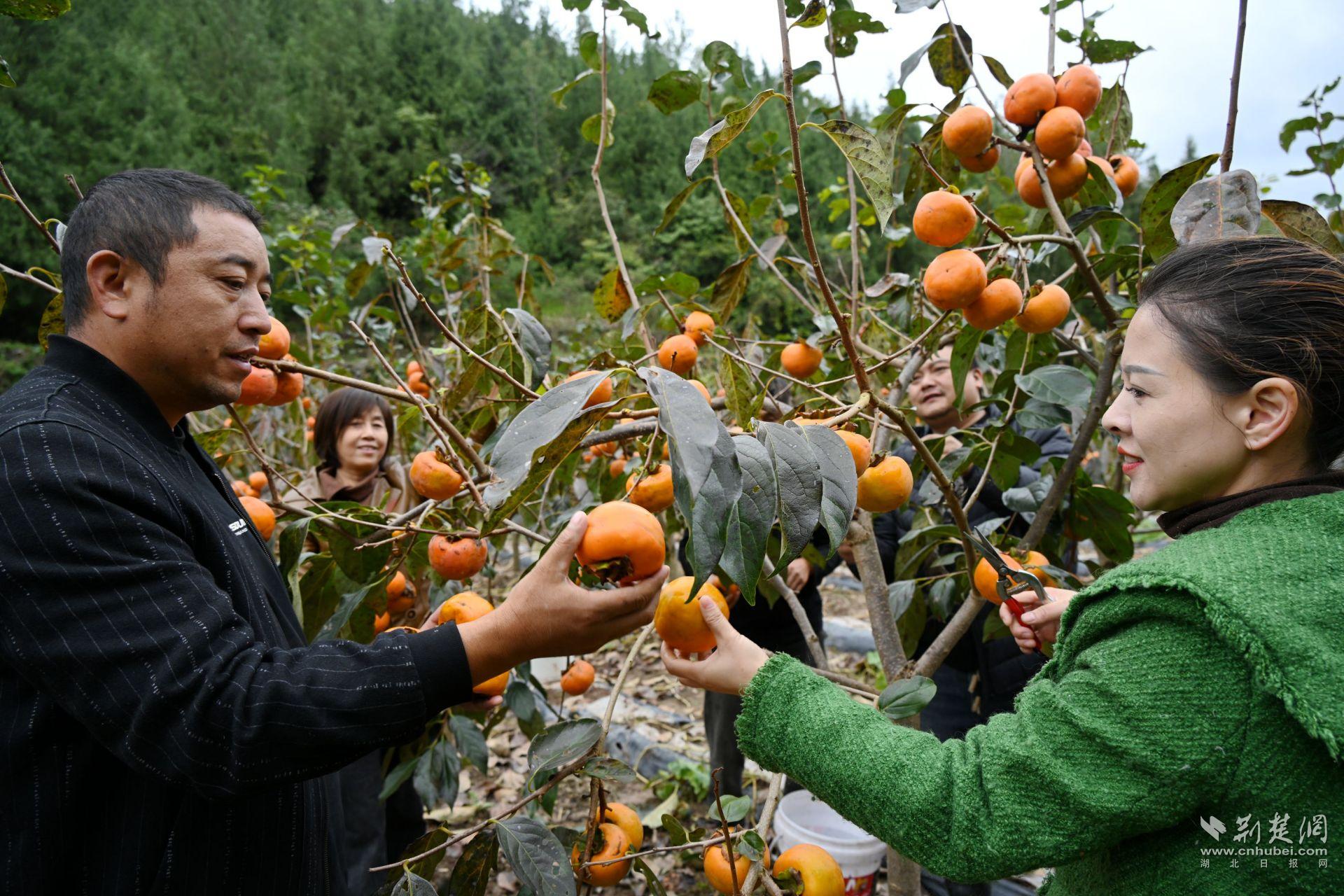 “这是引进的新品种甜柿,老顾客们都很喜欢!”肖美芳笑着介绍。今年,甜柿基地迎来丰产,尽管天气时有变化,但每逢周末和节假日,仍有不少老顾客电话预约,或自驾前来观光采摘。游客们现场采摘、品尝、拍摄短视频,通过直播将建始的优质农产品分享给全国网友,助力产业振兴。