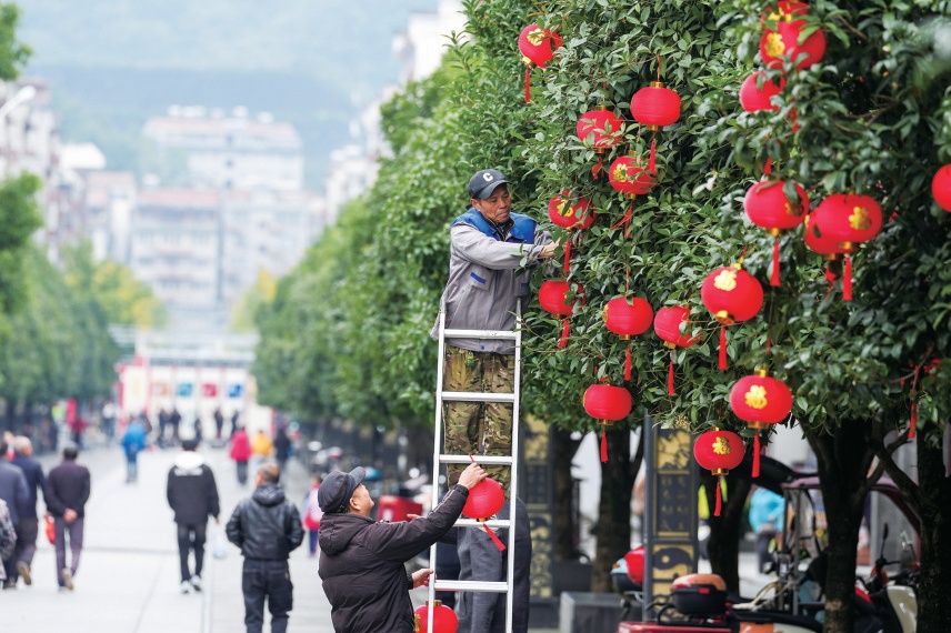 工作人员在玉虚街挂灯笼。