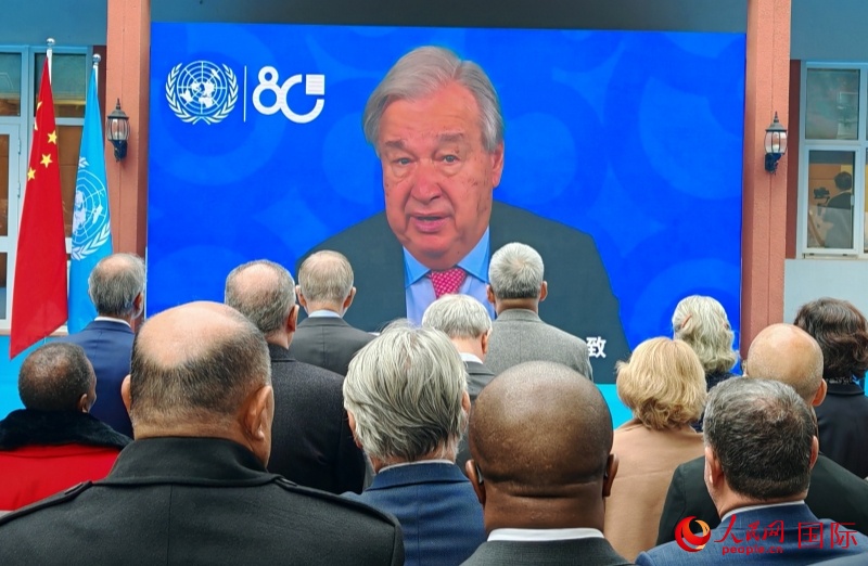 联合国秘书长古特雷斯发来联合国日致辞视频。人民网记者 李琰摄