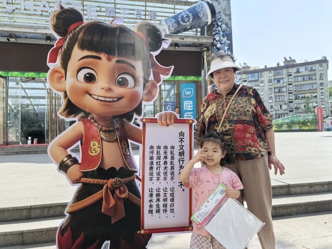“向不文明行为说‘不’,文明是垃圾入桶、遵守交规……”小朋友们围着“小哪吒”兴致昂扬朗读着文明标语,一名实验小学三年级的小朋友对家长说:“哪吒是守护家乡的大英雄,我也要做个文明好少年,让我的家乡变得更美丽。”