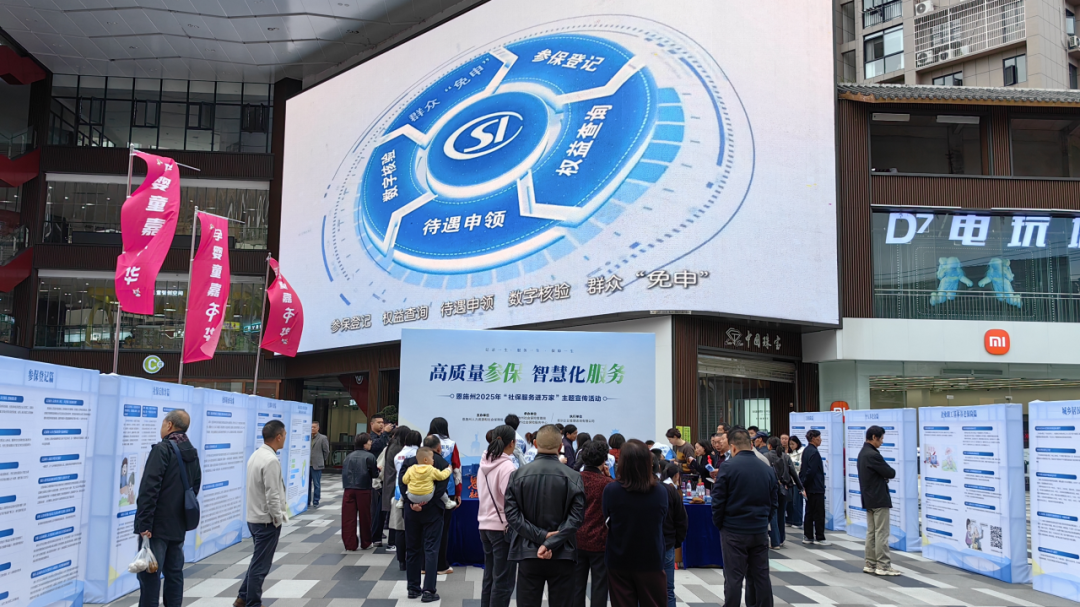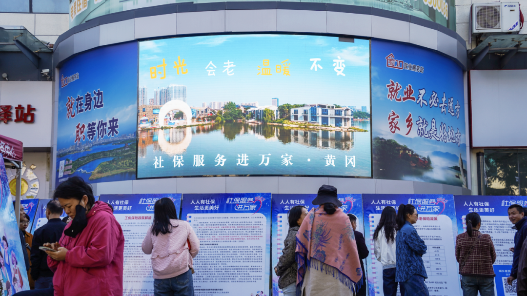 黄冈市“社保服务进万家”活动现场,群众在社保政策宣传展板前驻足观看。