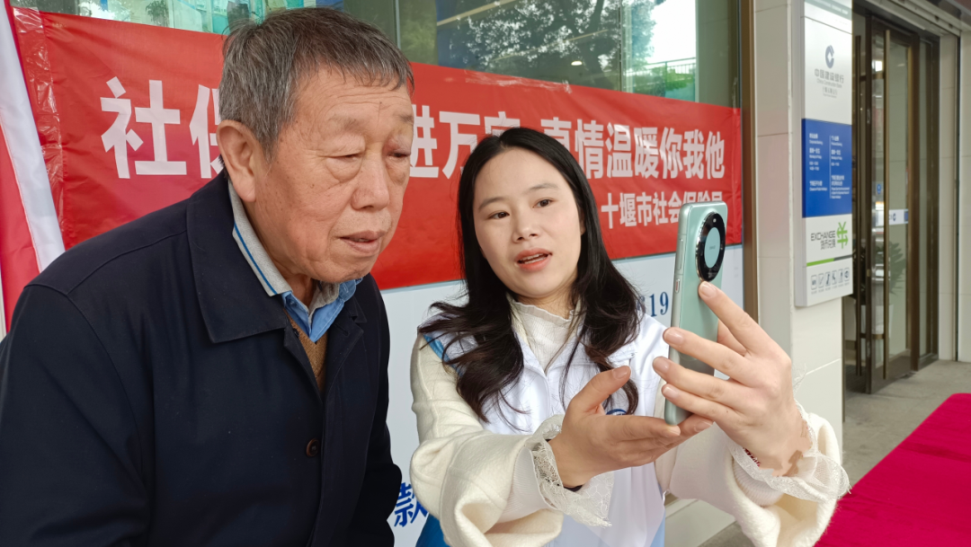 十堰市五堰建行“社银合作”网点,工作人员向群众演示社保业务“掌上办”。