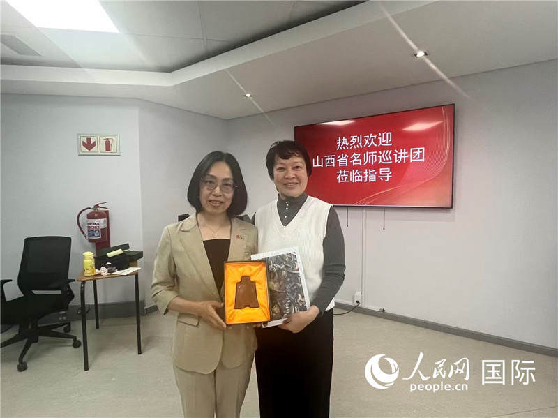 山西省名师巡讲团与西开普大学中医孔子学院互赠纪念品。人民网 董嘉怡摄