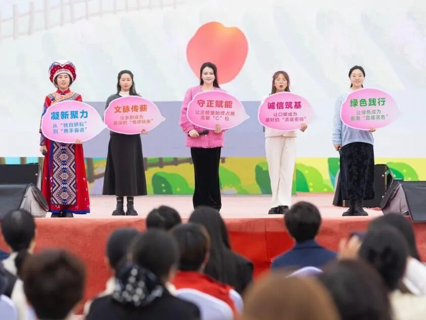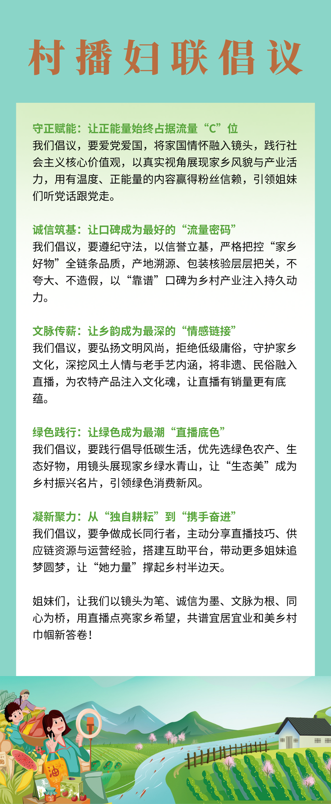 五位村播妇联代表共同发出倡议,以“守正赋能”锚定方向、“诚信筑基”坚守底线、“文脉传薪”延续根脉、“绿色践行”绘就底色、“凝新聚力”共赴新程,号召全国的女主播们坚守初心使命,凝聚巾帼合力,用直播点亮家乡希望,以实干担当共谱和美乡村巾帼新答卷。