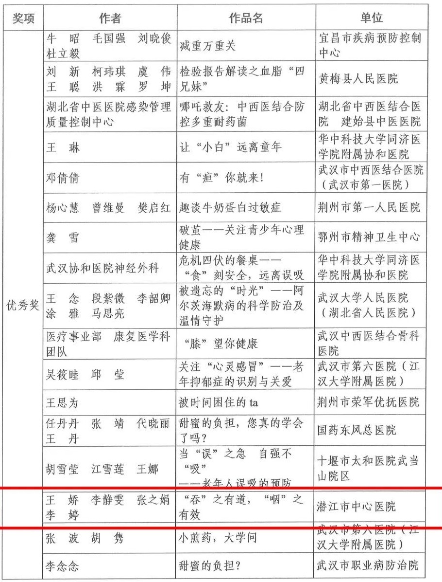 近日,湖北省卫生健康委员会等六部门联合印发《关于2025年度湖北省健康科普作品征集活动获奖情况的通报》,潜江市中心医院选送的两项作品《别让糖尿病蒙蔽了你的双眼》和《“吞”之有道,“咽”之有效》,在全省3082件参赛作品中脱颖而出,双双荣获省级健康科普作品优秀奖。