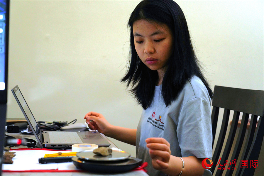 中方队员彭胜蓝对2025年调查石制品进行测量统计。人民网记者 黄炜鑫摄