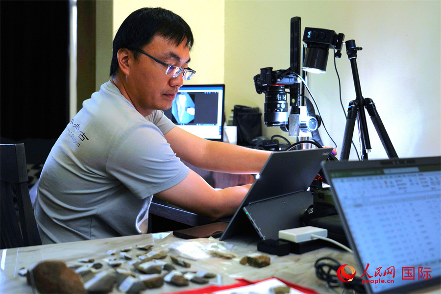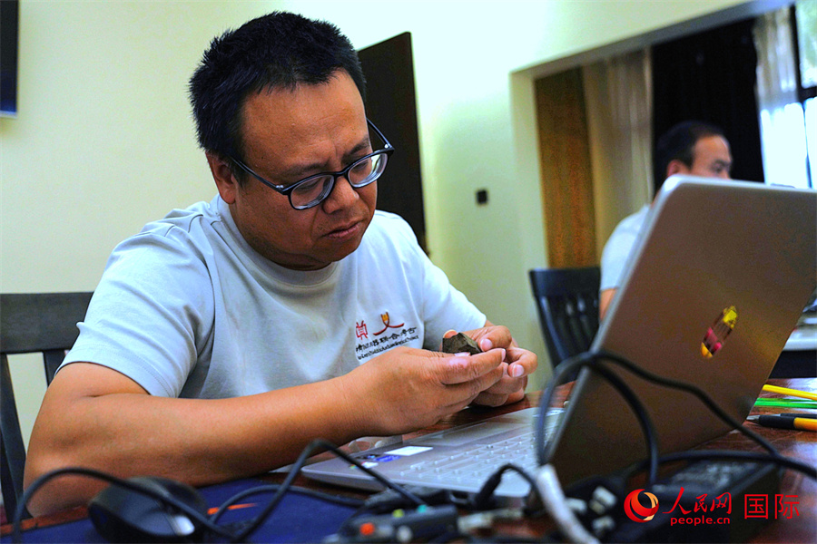 中方队员顾雪军对第10地点出土石制品进行分类整理。人民网记者 黄炜鑫摄