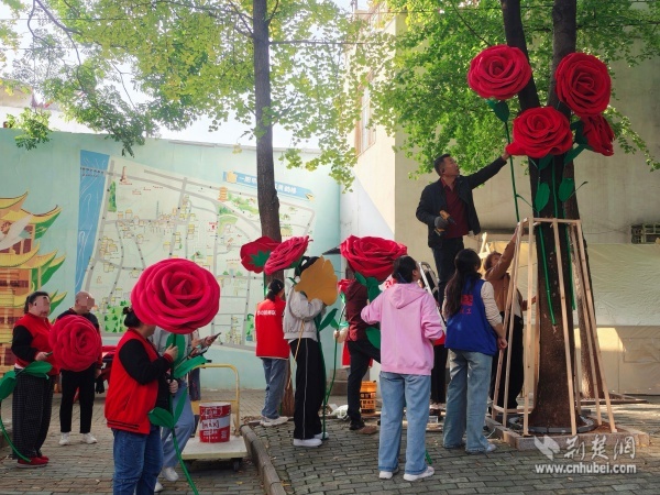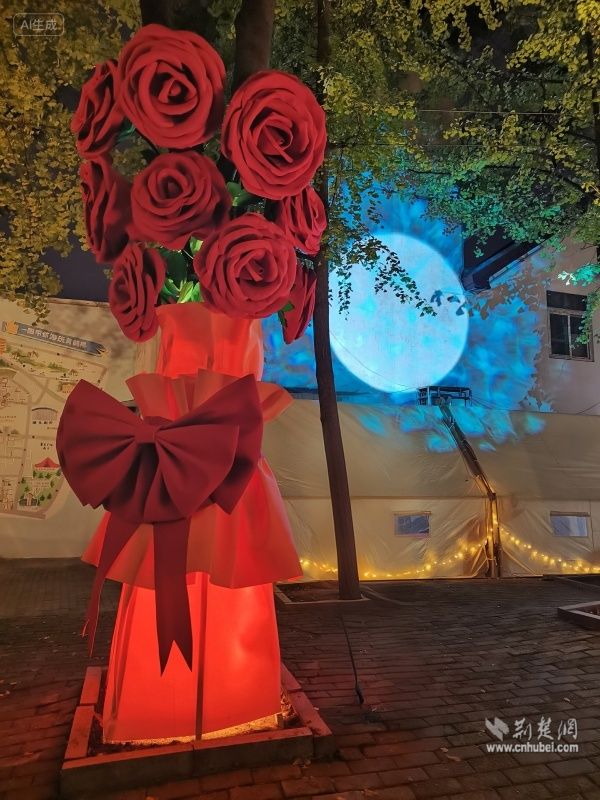 荆楚网(湖北日报网)讯(通讯员 陈晓燕 周佳颖)11月5日,武昌区黄鹤楼街道后宰门街角一道独特的风景引人注目,一棵“永不凋零”的“爱之树”绚丽绽放,树上盛开的巨型玫瑰花与一旁的月球投影装置相映成趣,与远方的黄鹤楼共同构成一幅诗意城市景观。