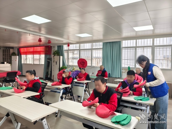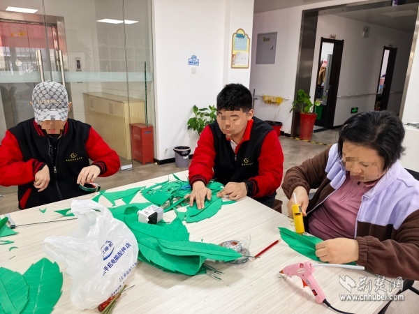 在为期两周的创作中,阳光家园学员在志愿者的陪伴下,从设计画图、精准剪裁到立体塑形、精细组装,系统学习并逐步掌握了银杏叶与玫瑰花的制作技巧。“第一次参与制作这么大的艺术作品,没想到我也能创造出这么美的作品!”一位学员自豪地展示成果。创作过程中,残健伙伴分工协作、各展所长,在默契配合中缔结了深厚情谊。