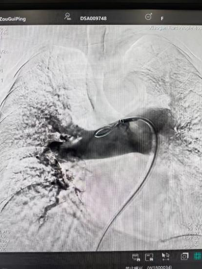 面对危急的病情,介入血管科团队在黄迁祥的带领下,对患者病情进行充分评估和综合研判后,最终制定了 “肺动脉抽栓 + 局部溶栓药物灌注 + 下腔静脉滤器置入术” 的微创介入治疗方案。