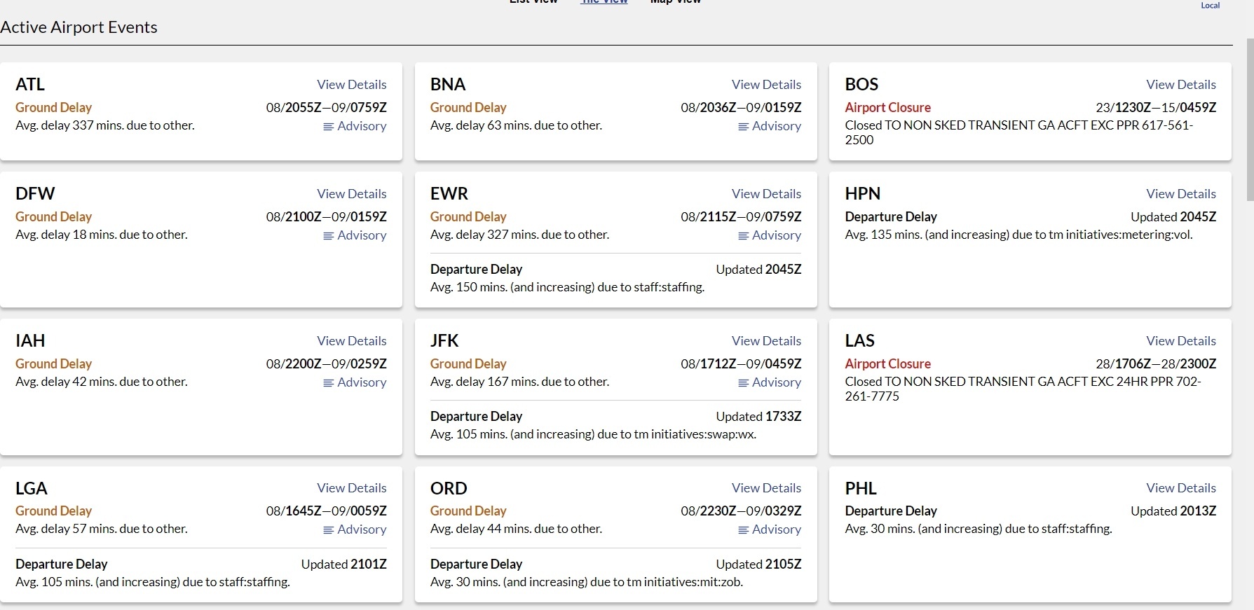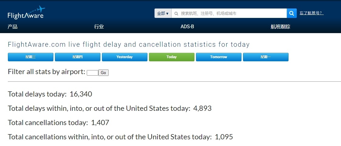 △航班追踪网站截图,美国部分出现延误情况的机场