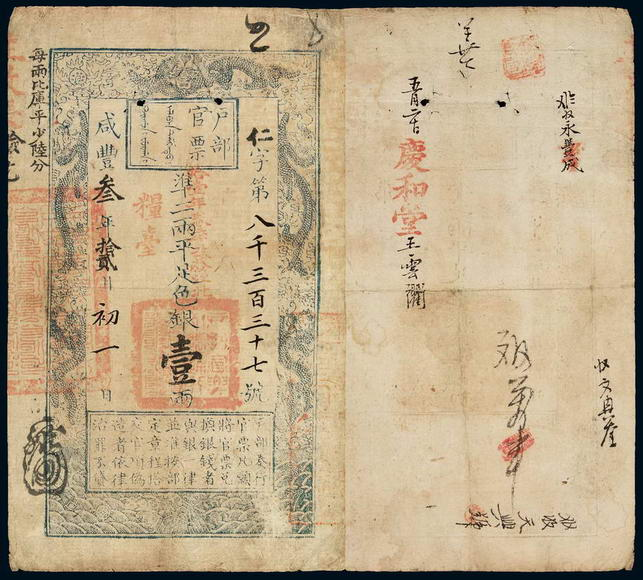 咸丰三年户部官票壹两一枚,仁字第八千三百三十七号,正面加盖“十一年春季改发江北”、“粮台”及墨戳小花押,图源首席收藏